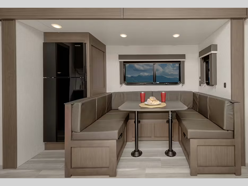 There is a Road Armor shock absorbing hitch pin for smooth towing and an engineered structural I-beam chassis with stamped steel cross-members and outriggers for added strength. You'll feel right at home with pleated privacy shades, residential, shaker style hardwood cabinet doors, and seamless pressed countertops.