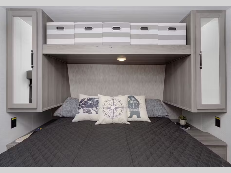 Inside, you'll enjoy blackout night shades, LED lighting, a stainless-steel sink, and pressed membrane premium countertops. The tankless water heater will provide endless hot showers and the 30k BTU furnace will help keep you warm on chilly evenings. Each model is also SolarFlex ready for off-grid capabilities, and there is Furrion backup camera prep for the option to make parking smoother.